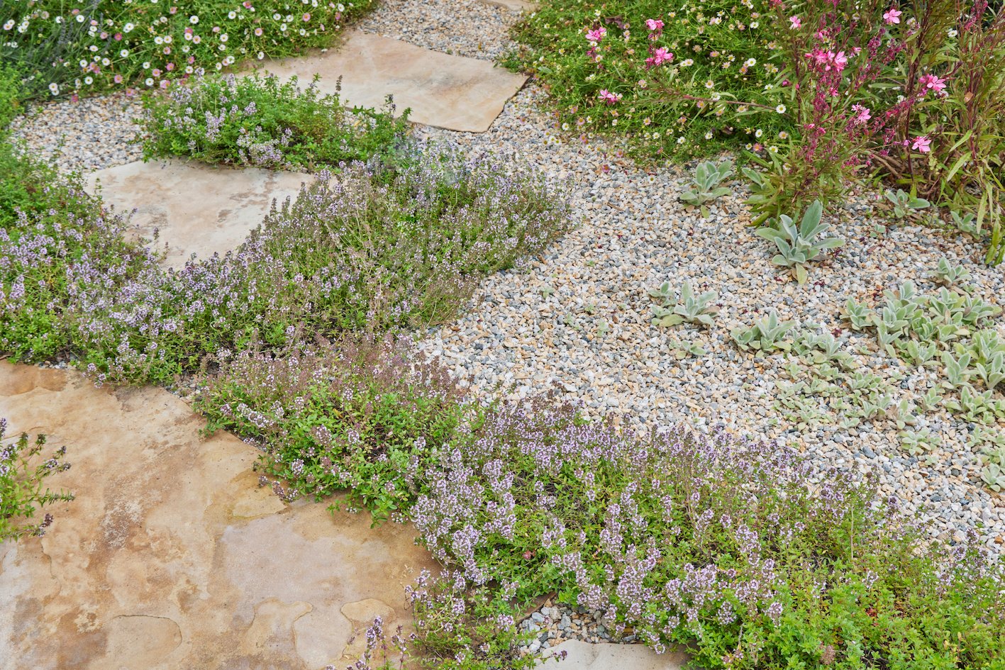 Um mosaico descontraído de pavimentação irregular e cascalho ao redor das bordas de uma quadra de estacionamento é o lar de auto-semeadoras que são facilmente desbastadas. O tomilho europeu selvagem (Thymus serpyllum) prospera ao longo das bordas das rochas quentes, com Erigeron karvinskianus semelhante a uma margarida, a ambiciosa orelha de cordeiro (Stachys byzantina) e Gaura lindheimeri.