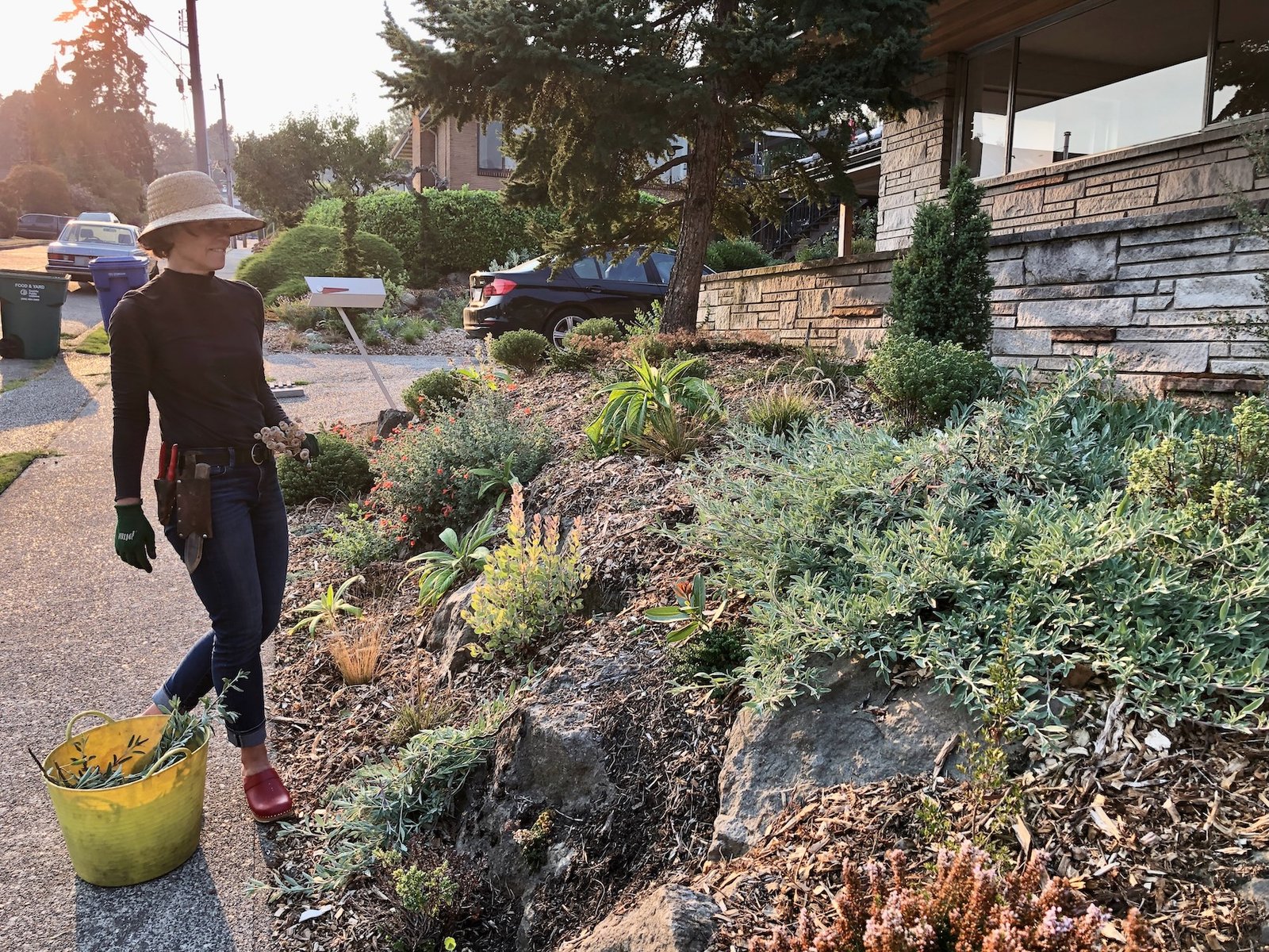 “Ficamos com os verdes dessaturados e os greens típicos das plantas da Nova Zelândia”, diz Jonathan. “Estávamos tentando fazer com que pareça mais um jardim seco, o que é.” Ele e Jane também plantaram nativos e plantas das costas do Oregon e do norte da Califórnia. “A paleta geral de plantas resistentes e secas ajudou a criar um jardim mais adaptado ao clima que tolere os verões cada vez mais longos, secos e quentes de Seattle, com pouca irrigação suplementar necessária.”