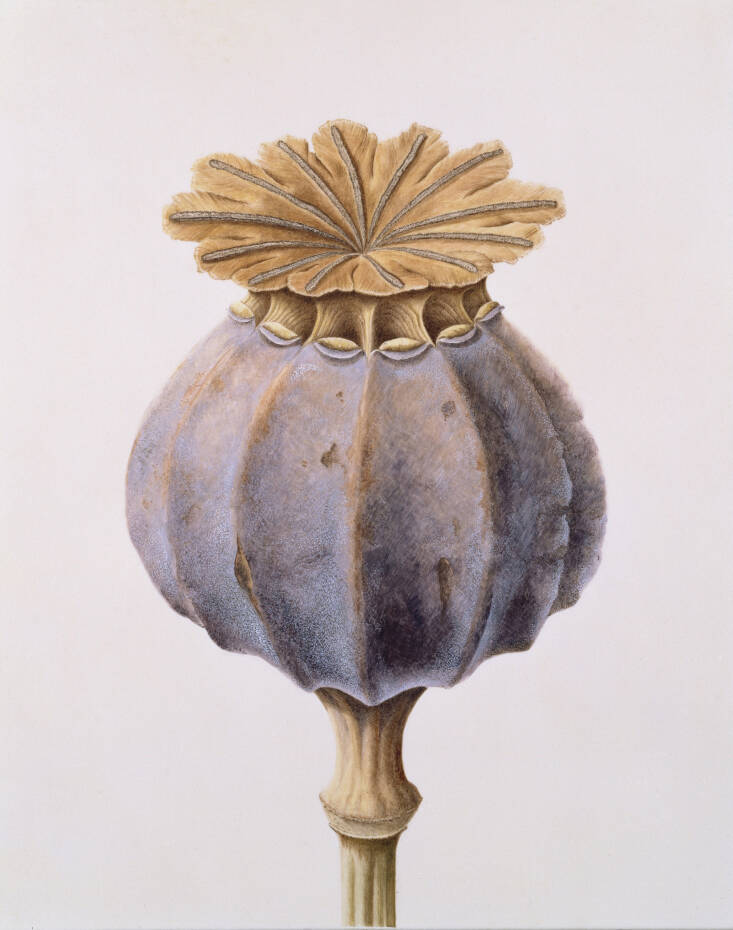 Acima: Uma semente de papoula da artista botânica Brigid Edwards. Faz parte da mostra atual do Museu Ashmolean, Em flor: como as plantas mudaram nosso mundo. Fotografia cortesia da Coleção Shirley Sherwood/Museu Ashmolean.