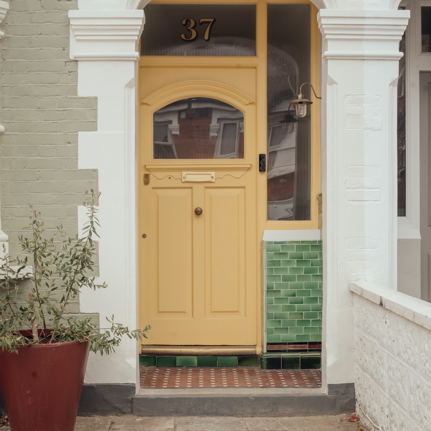 Twin Pitches London remodelado pelo Atelier Baulier. Fotografia de Jim Stephenson. Acima: Azulejos em diferentes tons e padrões combinados com tinta amarela ensolarada criam uma cena vencedora na porta da frente. (A tinta de linhaça apropriada para o período é de Brouns & Co..) Fotografia de Jim Stephenson, cortesia do Atelier Baulier, de Negócios na frente, festa nos fundos: uma atualização criativa e ecológica da casa no oeste de Londres.
