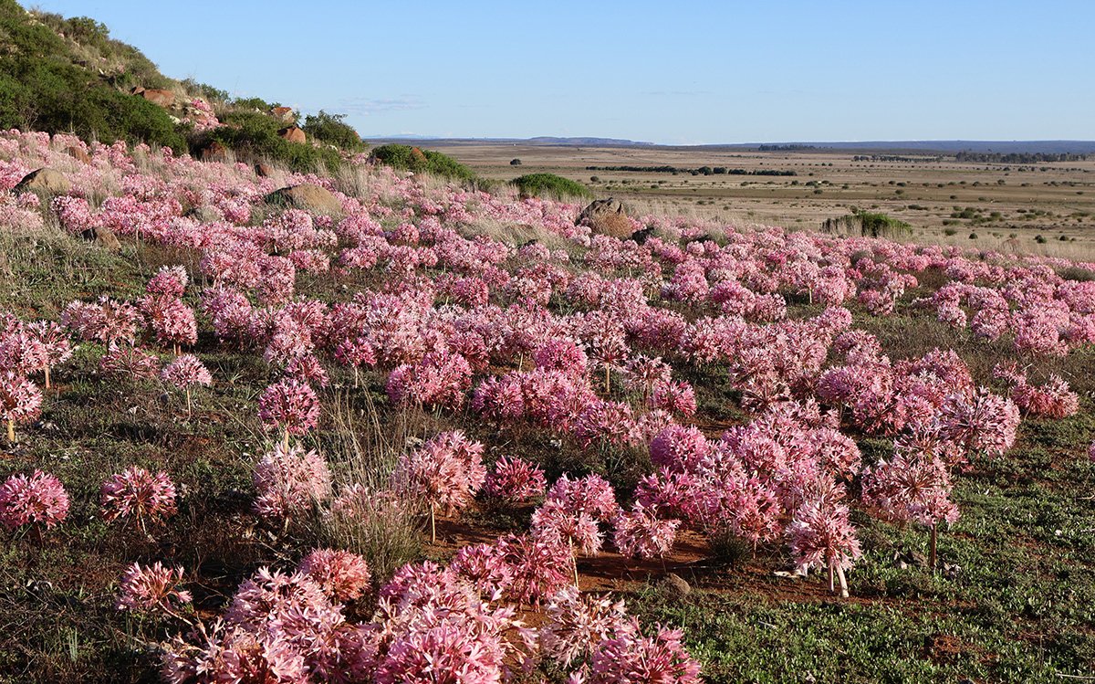 Se começar a chover no Hantam em março, e se a chuva meter mais de 10 mm, você quase poderá definir seu cronômetro: depois de um verão longo, seco e muito quente, os Brunsvigias florescerão, três semanas depois. Você tem essas semanas para planejar uma visita para ver a visão de uma vida. Na terra vermelha assada desta região de alta escarpa da província do Cabo do Norte da África do Sul, as lâmpadas de Brunsvigia sentem a umidade e começam a desenvolver brotos. Cada lâmpada produz uma haste robusta que suporta dezenas de flores em uma explosão de rosa – rosa, rosa quente, rosa rosa e, raramente, branco. De 12 a 16 polegadas de diâmetro, as flores de Brunsvigia Bosmaniae (também conhecidas como lírios de candelabros) explodem através da velocidade seca, sem folhas e incongruentes entre as gramíneas secas em tons de prata, o solo vermelho e as minúsculas mudas justificadas da exibição de flores mais famosas a vir.