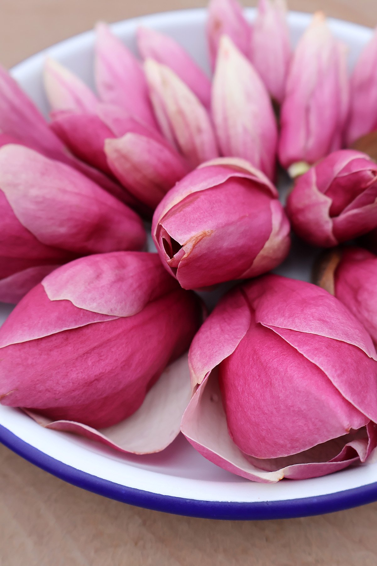 Primeiro, encontre suas magnólias. Se você não cultiva uma árvore, isso não é licença para atacar uma em um jardim botânico. Mas como as árvores florescem tão abundantemente, considere o início da primavera um ótimo momento para fazer amizade com seus vizinhos ou estranhos. Bilhetes embaixo das portas e nas caixas de correio, promessas de um pote cheio em troca e botões em troca (colhidos de toda a árvore, não apenas de um galho) é tudo o que você precisa. E incentivo os agricultores a levarem as suas flores aos mercados locais, embaladas na vertical em caixas de cartão azuis – os botões de magnólia duram muito bem desde que sejam mantidos frios, como qualquer outro ingrediente perecível da Primavera.